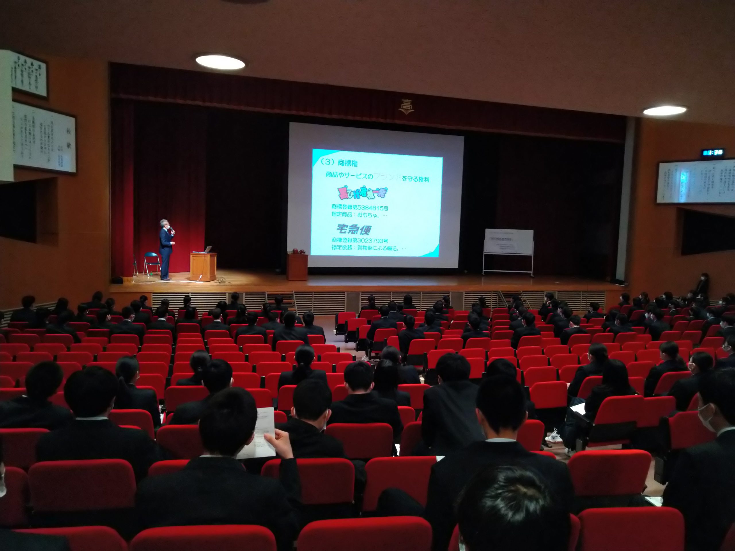 第1学年生を対象に、午後の授業の一コマで知的財産特別授業を行いました。新型コロナ感染防止対策として、生徒たちはマスク着用の上、隣は空けて着席してもらいましたので、講堂の2階席まで使用されていました。