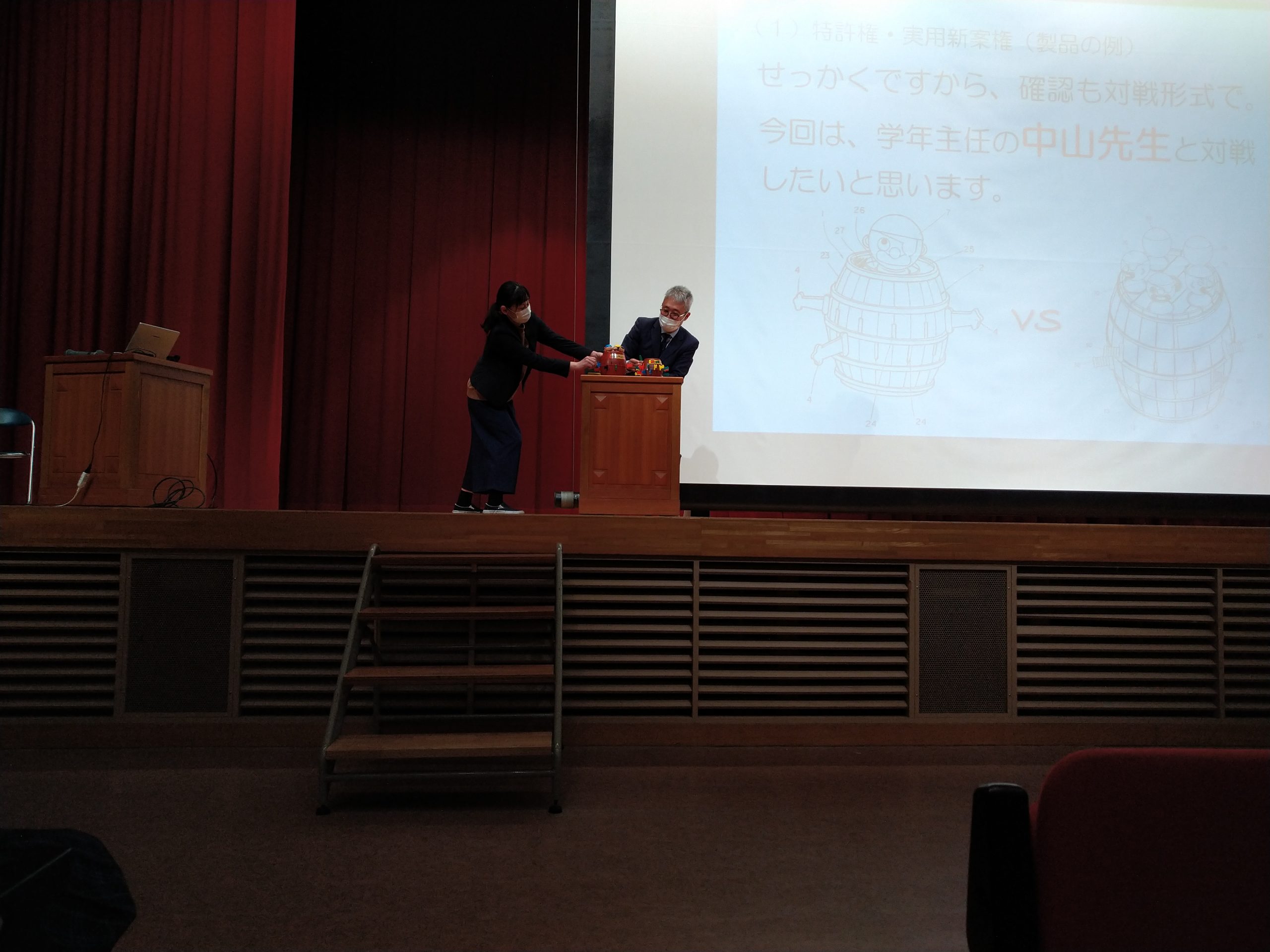 前半(30分)では、相田委員が知的財産とは何か?及び知的財産権にはどのようなものがあるか?についてのわかりやすい資料での説明の他に、二つのユニークな取り組みをしました。ひとつは、講師の個人情報(子供の数)が書かれたプリントを生徒に回覧・回収した後、講師の子供の数をクイズとして出題し、指でその数を回答してもらうというものです。プリントは手元にないのに講師の個人情報を知っているという体験を通じて、情報には形がなくて簡単にコピーできて他人にも利用されやすいとの知的財産の特徴に気付いてもらえました。もうひとつは、黒ひげ危機一発(商品はタカラトミーから発売)の実用新案から特許出願への進化について説明後に講師と学年主任の先生が対戦をしました。黒ひげが飛び出して決着がついたときは大歓声が起きて大いに盛り上がりました。
