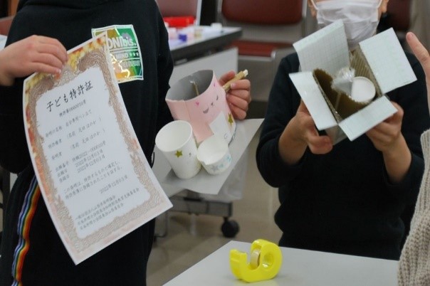 る姿には、たいへん感銘を受けました。子どもたちに、発明者及び権利者として自分の名前が記入されている『こども特許証』を授与し、父母によ