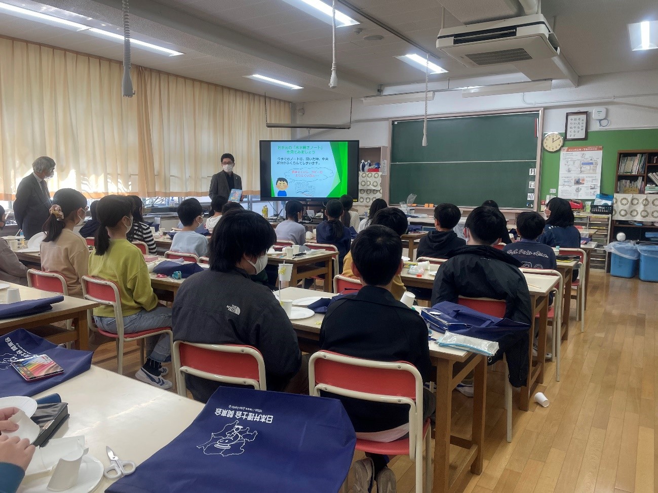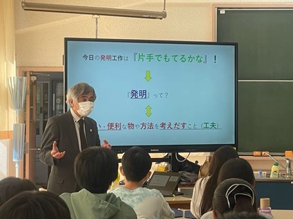 今回、知財授業及び発明工作授業(45分)を6年生3クラス(1クラス約30名)に対し行いました。